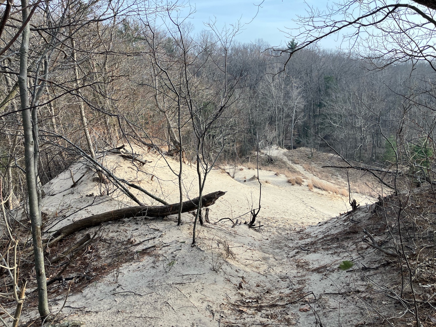 South Haven is not the lakeside town I knew in my youth, with supermarkets, local hardware, and dimestores downtown, along with small industries and regional tourism. No, it has given over completely to a tourist town identity, and instead features fudge shops, souvenir stands with tacky teeshirts, ice cream–and lots of restaurants, bakeries, and other assorted treats. Food was not a problem, but I puzzled where the local folk got their groceries and bought nails. Holland? I suppose. That city has become a massive sprawl that I largely avoid these days. Headed back, then stopped at Weko Beach, which, owing to relatively recent acquisitions by the state, is now directly adjacent to Warren Dunes State Park, where I spent so many years amidst its woods and drifting sands.
